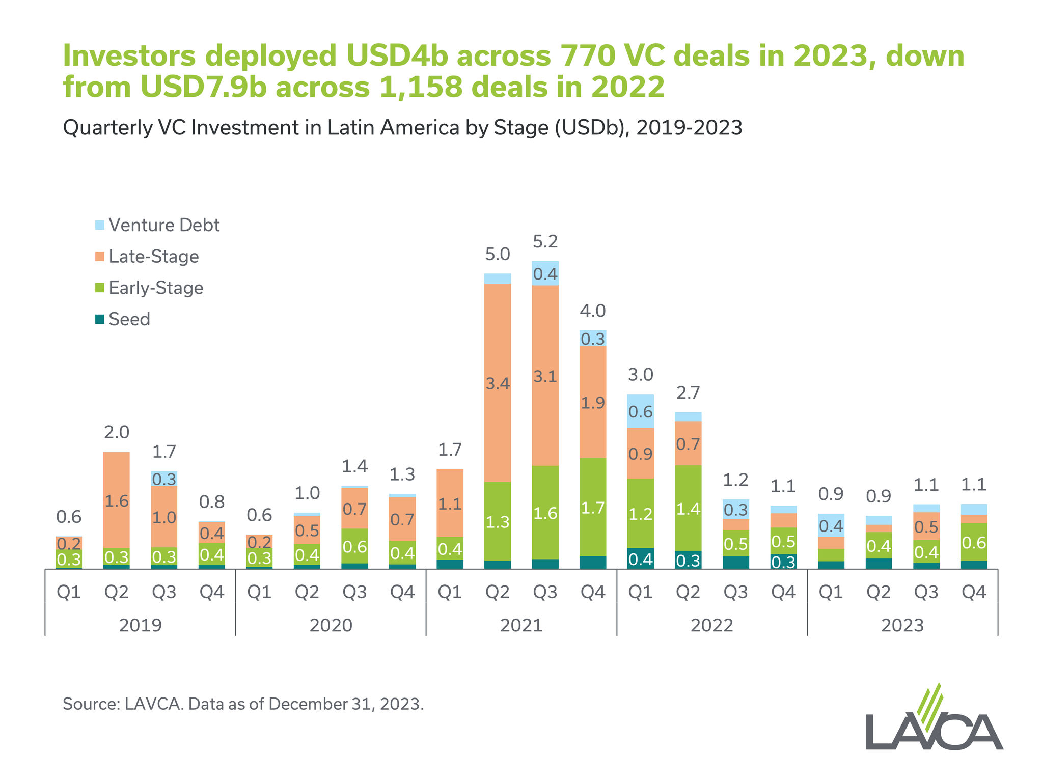 The latest venture investment data from LAVCA reveals that the venture capital scene in Latin America saw a considerable adjustment in 2023. Total investments fell to $4 billion, a sharp decline from $7.9 billion in 2022 and a significant drop from the unsustainable $16 billion peak in 2021. The deal count also took a dip, with transactions decreasing to 770 from 1,158.